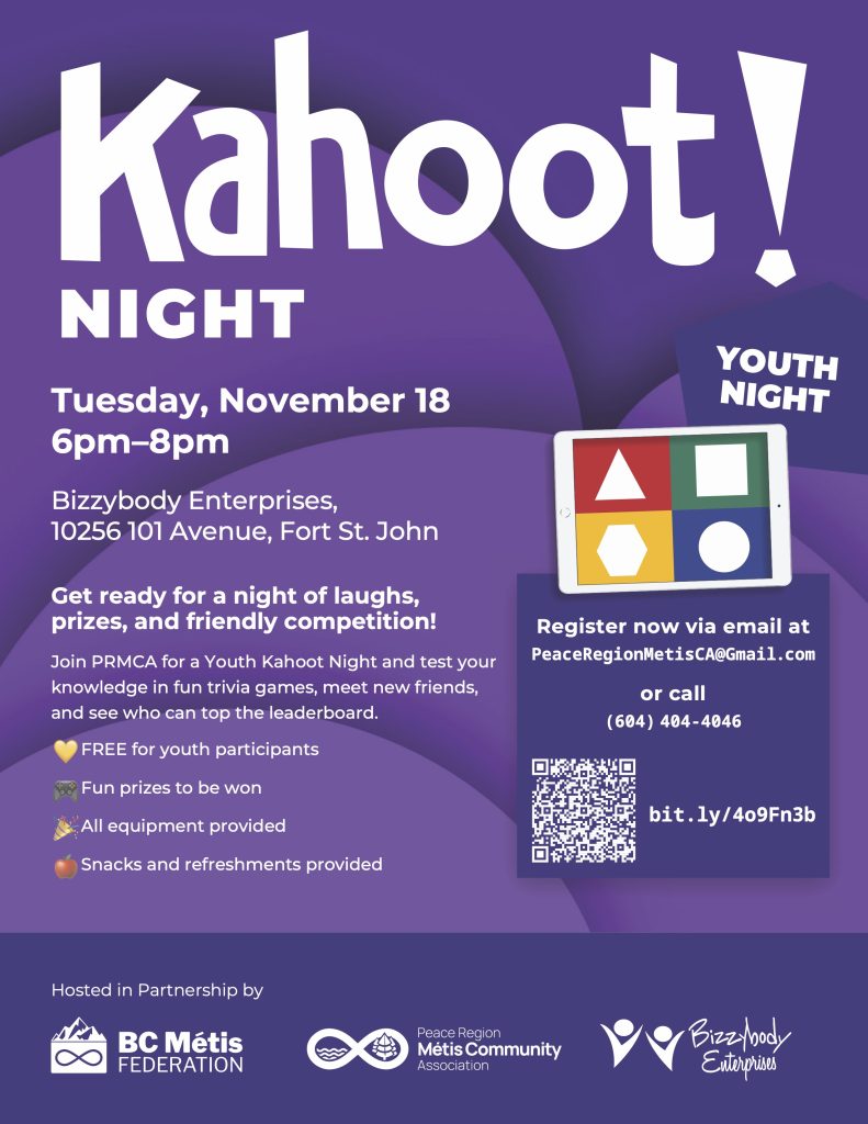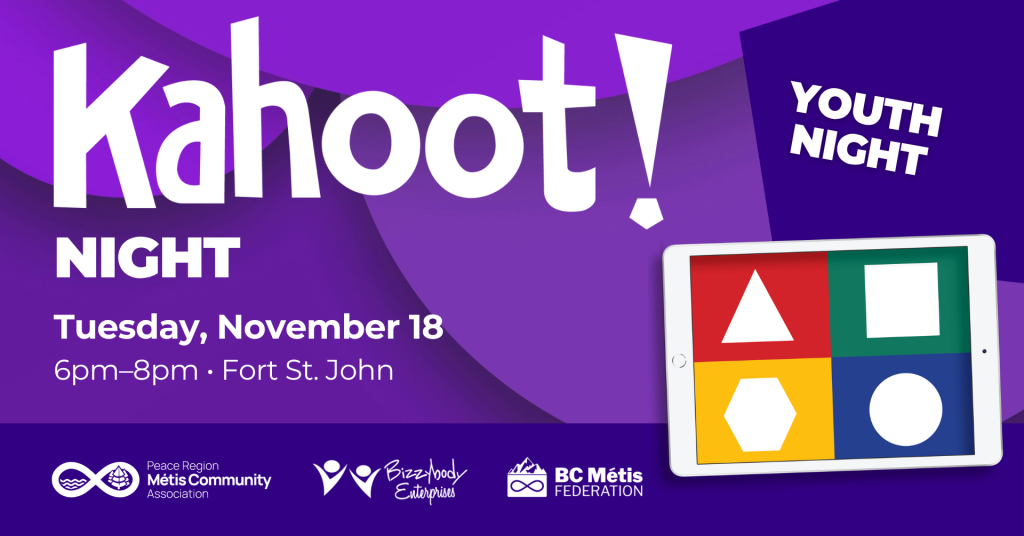Get ready for a night of laughs, prizes, and friendly competition! Join the Peace Region Métis Community Association (PRMCA) for a Youth Kahoot Night on Tuesday, November 18, from 6 pm to 8 pm. Come test your knowledge in fun trivia games, meet new friends, and see who can top the leaderboard. Light snacks and refreshments will be provided.
