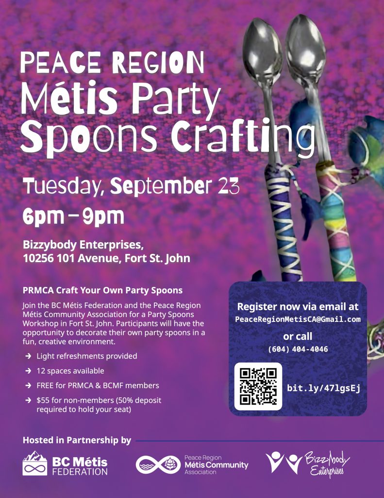 Join the BC Métis Federation and the Peace Region Métis Community Association for a Party Spoons Workshop in Fort St. John. Participants will have the opportunity to decorate their own party spoons in a fun, creative environment.