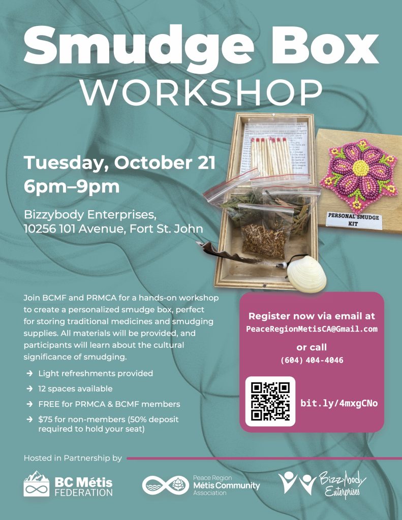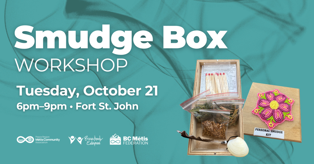 Join BCMF and PRMCA for a hands-on workshop to create a personalized smudge box, perfect for storing traditional medicines and smudging supplies. All materials will be provided, and participants will learn about the cultural significance of smudging. The workshop is happening at Bizzybody Enterprises (10256-101 Avenue, Fort St. John).
