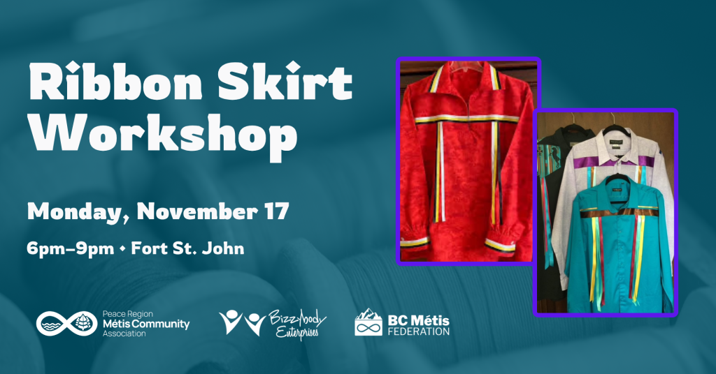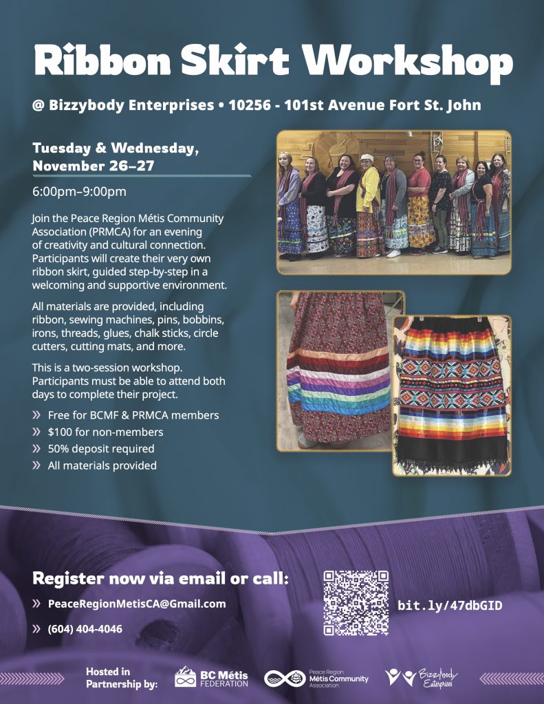 Join the Peace Region Métis Community Association (PRMCA) for two evenings of creativity and cultural connection. Participants will create their very own ribbon skirt, guided step-by-step in a welcoming and supportive environment. All materials are provided, including ribbon, sewing machines, pins, bobbins, irons, threads, glues, chalk sticks, circle cutters, cutting mats, and more.