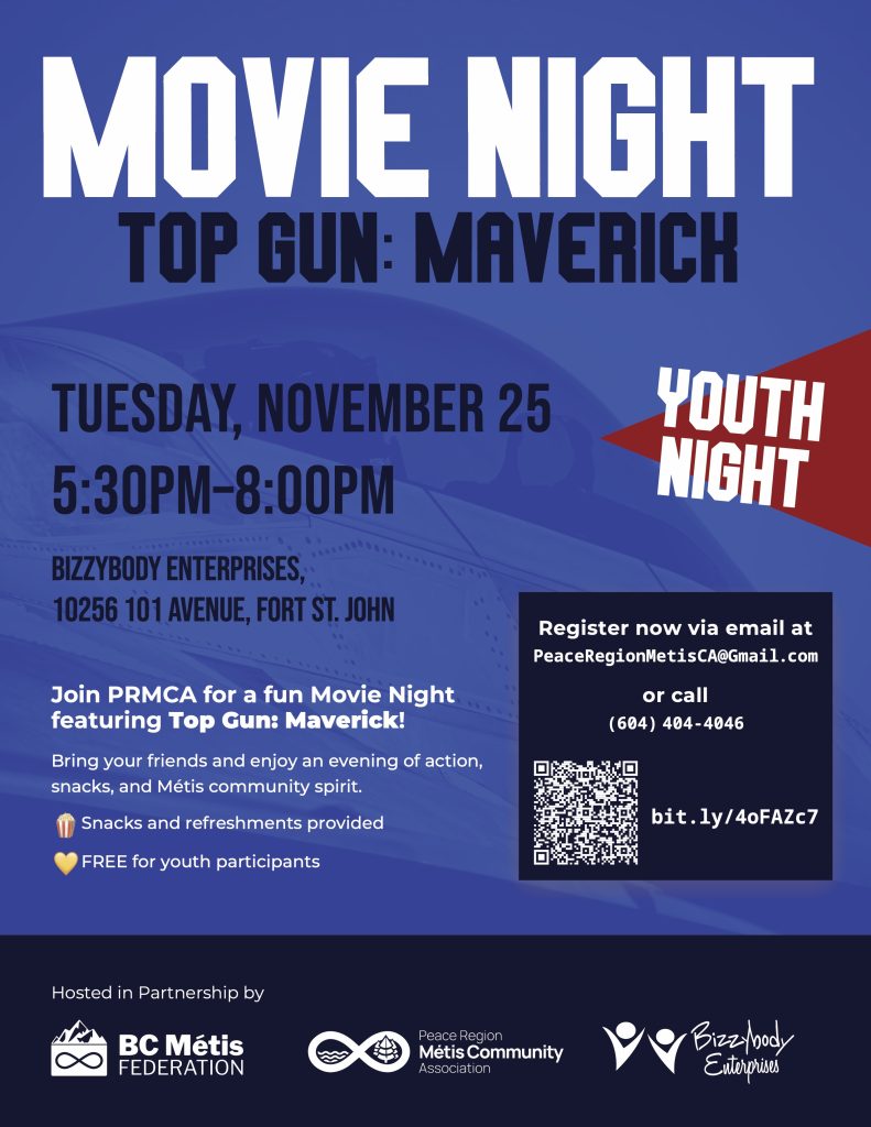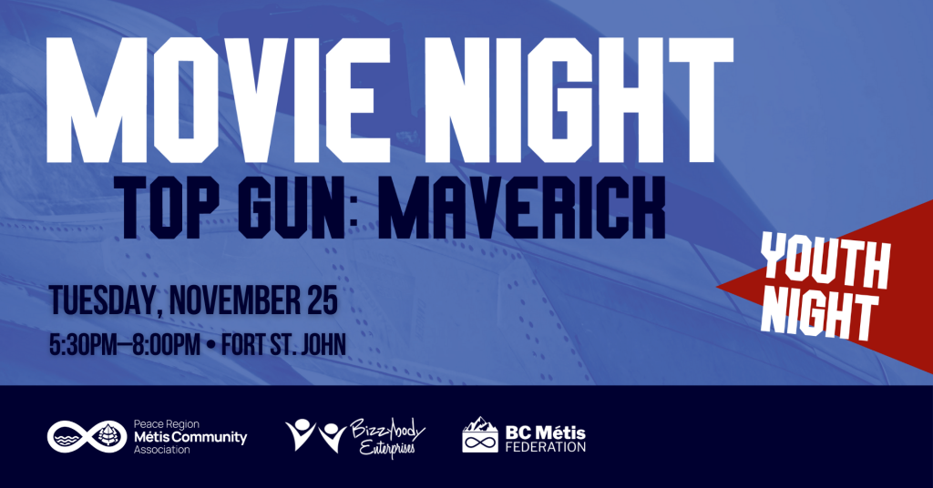 Join the Peace Region Métis Community Association (PRMCA) for a fun Movie Night featuring Top Gun: Maverick. Bring your friends and enjoy an evening of action, snacks, and Métis community spirit.