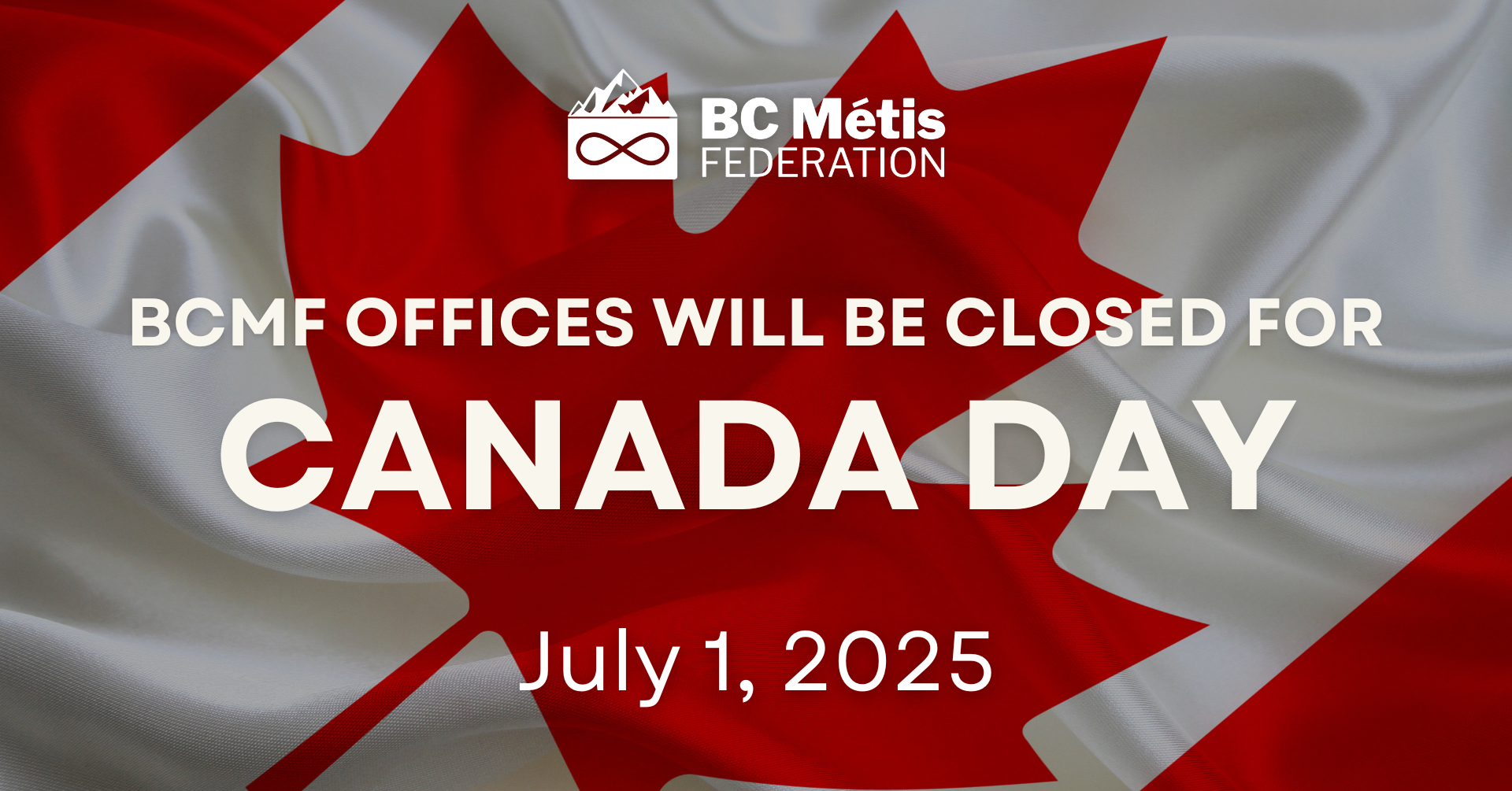 Please note that the BC Métis Federation offices will be closed on Tuesday, July 1st in observance of Canada Day. Regular operations will resume on Wednesday, July 2nd.